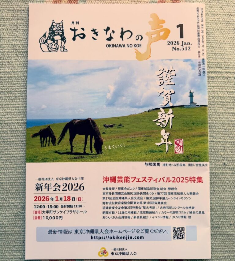 (一社)東京沖縄県人会の会報誌『おきなわの声』の編集長もしております 1月号は28ページ 特集は沖縄芸能フェスティバル2025の模様を一挙6ページにてご紹介。川平朝清先生のコラムや、たるーさんの島唄コラムもありボリューム満点なのです。 東京沖縄県人会の会員みなさまに届きます ご入会ぜひぜひ https://okikenjin.com #東京沖縄県人会 #おきなわの声 #美ら島沖縄大使 […]